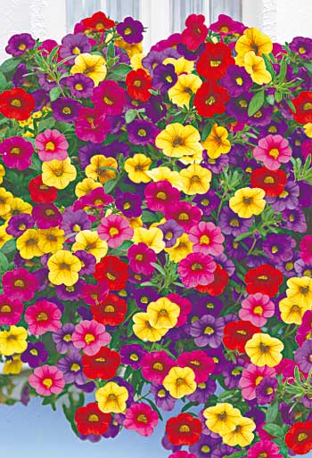 KVETY: Tri farby v kvetináči – červená, modrá, žltá. Množstvo drobných kvetov, relatívne odolné voči dažďu.