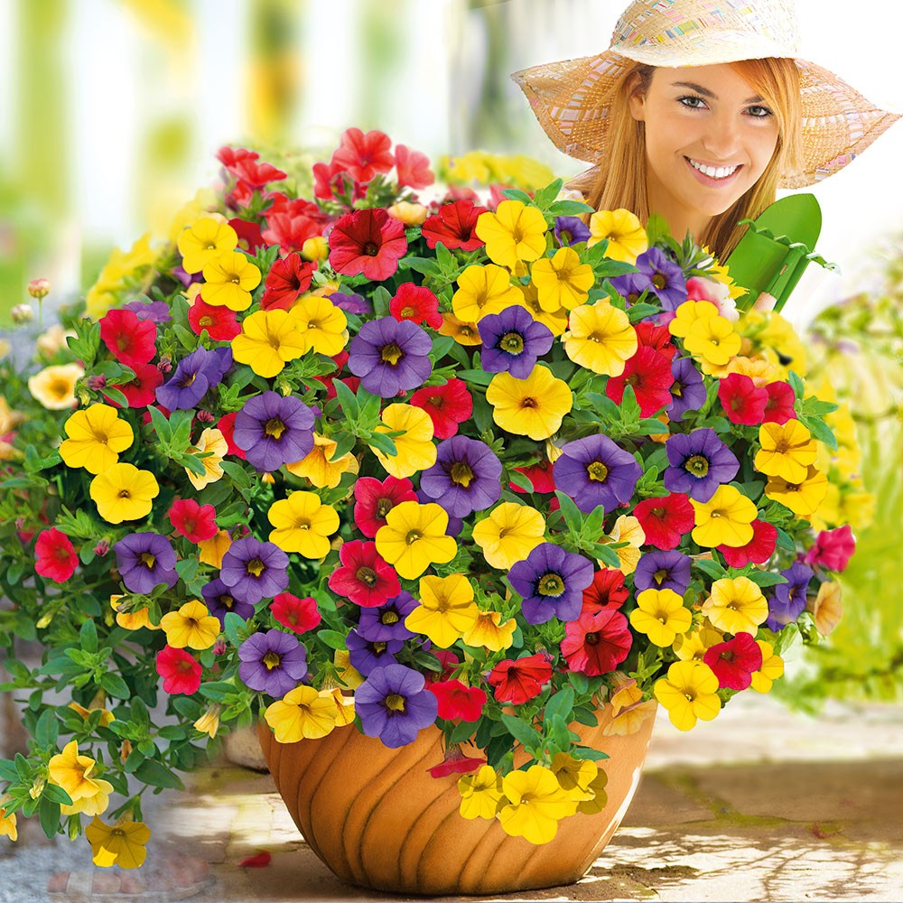 Na rozdiel od svojich veľkých „Vista“ príbuzných je „Mini Vista“ jemnejšie a kompaktnejšie rastúca petúnia, s o niečo menšími, ale rovnako bohatými a dlhotrvajúcimi kvetmi. Ideálna je tam, kde túžite po kráse aj na malom priestore – napríklad na balkóne, terase alebo v menších črepníkoch. Zostava Karneval obsahuje vzájomne harmonizujúce farby: červenú, žltú a fialovo-modrú. Tri rastliny v jednom črepníku.