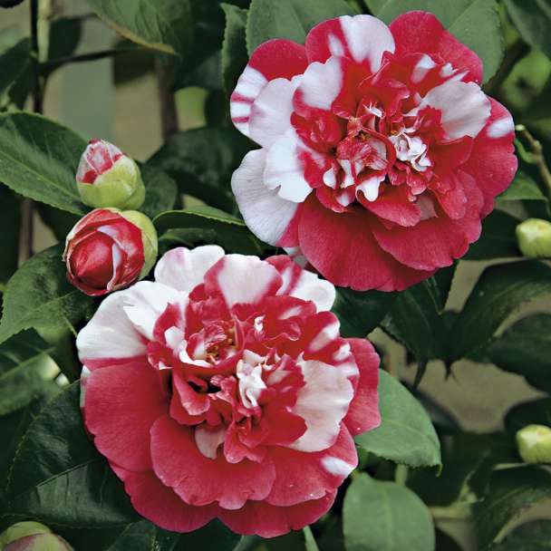 Kamélia General Coletti: Plnokvetý, zimovzdorný šľachtený ker. Výborný solitér, na jar nápadné kvety priťahujú pozornosť. Červenobiele kvety príjemnej vône, vždyzelené, lesklé listy.