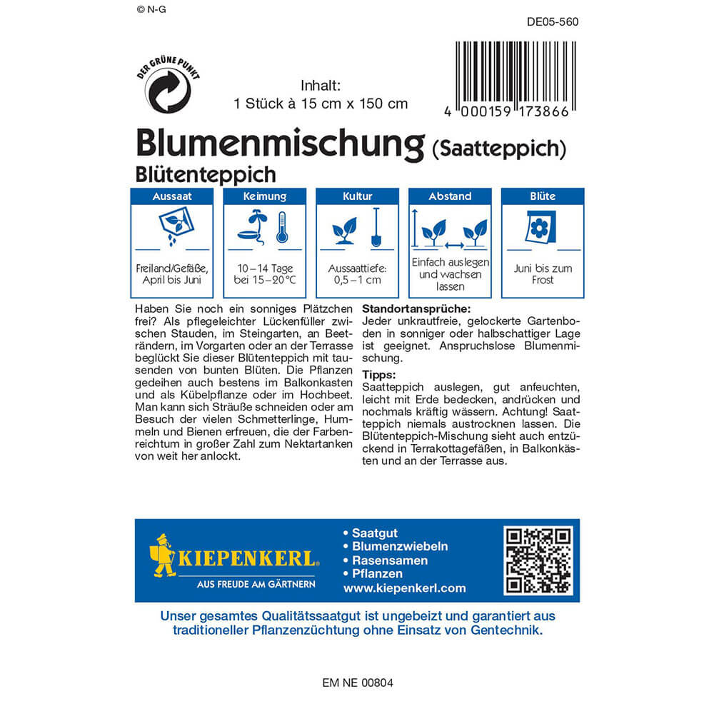 Obsah balenia:1 ks Medzi trvalkami, na okrajoch záhonov, skalnícv alebo pozdĺž terasy sa určite nájde voľné miesto pre „Kvitnúci koberec“ Jednoročné rastliny dorastajú do výšky okolo 30 cm, a preto sa im bude dobre dariť aj v kvetináčoch alebo vyvýšených záhonoch. Pestrofarebné kvety od júna do mrazov. Nektár a peľ pritiahnu mnoho užitočného hmyzu, ktorý prispieva k vyváženému ekosystému. Pohodlná výsadba pomocou výsevného pásu.