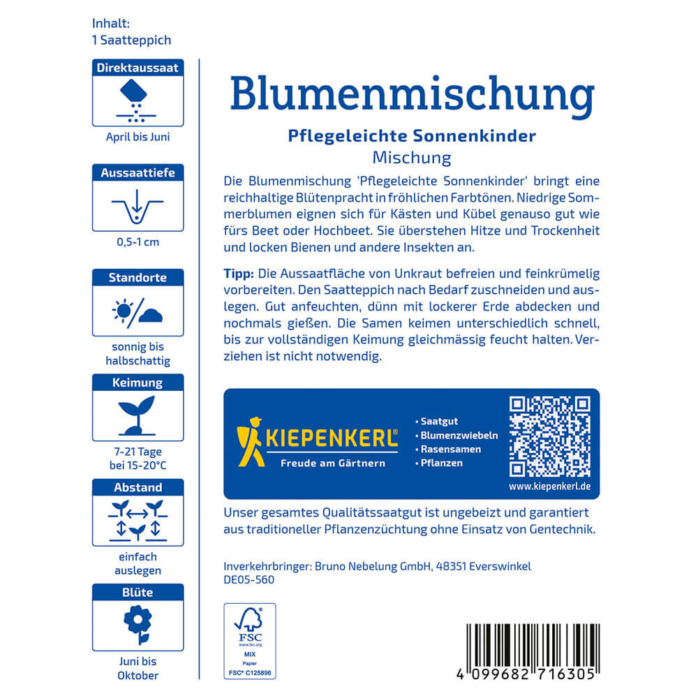 Obsah balenia:1 ks Nízke, kvitnúce letničky odolné voči teplu a suchu. Dorastajú do výšky 20-30 cm. Ideálne pre nádoby, kvetináče a záhony. Nenáročné. Užite si rozkvitnutú záhradu alebo balkón, ktorá tiež priťahuje hmyz. Výsevný pás 15x150 cm.