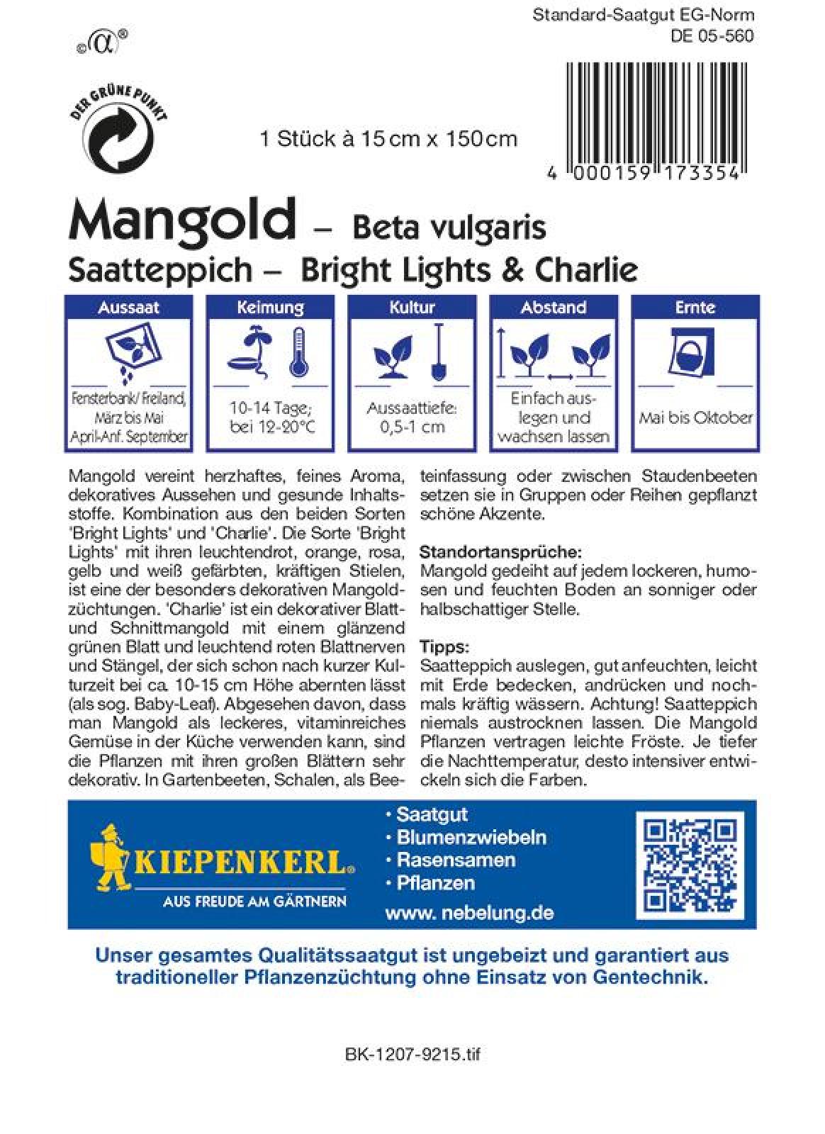 Obsah balenia:1 ks Zmes pestrých odrôd mangoldu s vysokým výnosom a príjemnou chuťou. Dekoratívne listové stonky vo všetkých farbách dúhy. Zelenina bohatá na vitamíny. Kombinácia 2 farebných druhov. Obsah stačí na cca. 15 x 150 cm.