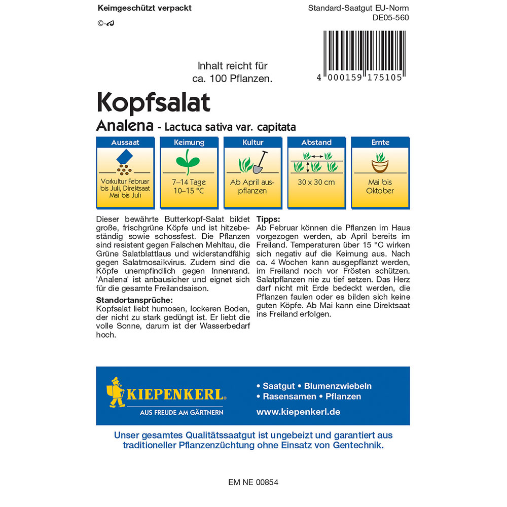 Obsah balenia:1 ks Šalát Analena je nástupcom obľúbeného šalátu Estelle. Pred zberom letného šalátu vytvára veľké svieže zelené hlávky, ktoré tvoria základ všetkých chutných a zdravých šalátov. Obsah vystačí cca. na 100 rastlín šalátu. Keďže hlávkový šalát Analena je odolný voči teplu a skrúteniu, ako aj voči peronospóre, voškám zo zeleného šalátu a vírusu mozaiky šalátu, úspech pestovania vlastného šalátu je takmer vopred zaručený!