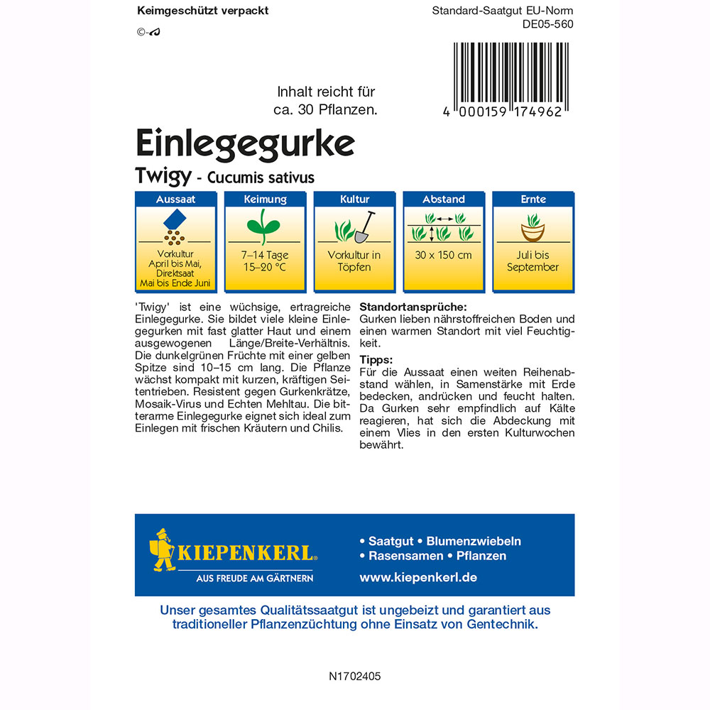 Obsah balenia:1 ks Uhorka nakladačka Kiepenkerl Twigy F1 je mierne horká, silná a vysoko výnosná uhorka, ktorá je odolná voči chrastavitosti uhoriek, vírusu mozaiky a múčnatke. Jemná, takmer hladká uhorka tvorí veľa malých, tmavozelených plodov so žltou špičkou, ktoré môžu dorásť až do 15 cm. Uhorka Twigy F1 je vhodná na čerstvú konzumáciu aj kulinárske výtvory. Odporúča sa najmä nakladanie čerstvými bylinkami a čili.