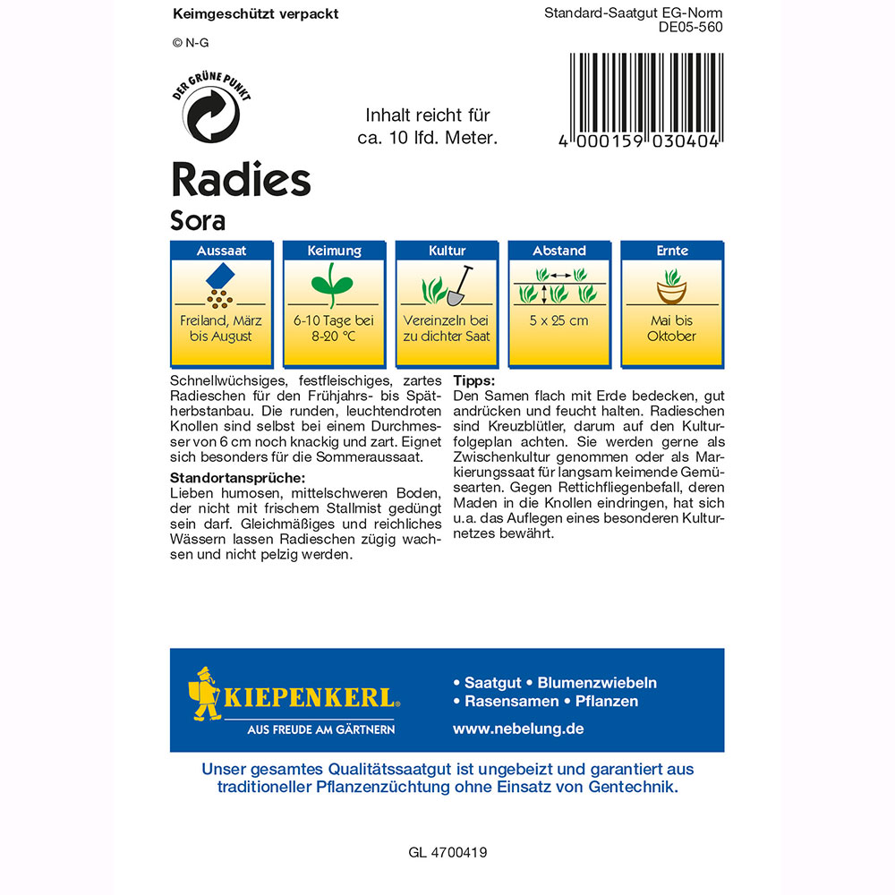 Obsah balenia:1 ks Reďkovky Sora z Kiepenkerlu patria medzi obzvlášť rýchlo rastúce odrody reďkoviek, ktorých plody sú vďaka pevnej dužine a lahodnej chuti vhodné na mnohoraké využitie vo vašej kuchyni. Jasne červené hľuzy sa konzumujú čerstvé, no reďkovky Sora sú dobré aj do šalátov alebo ako príloha. Reďkovky môžu dosiahnuť priemer 6 cm. Obsah balenia vystačí približne na 10 bežných metrov.