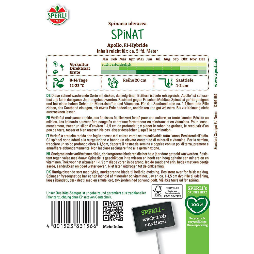 Obsah balenia:1 ks Špenát Apollo zaujme nielen svojim rýchlym rastom, ale aj sviežimi, tmavo zelenými listami. Vhodný na konzumáciu za surova, tepelnú úpravu aj na zmrazenie. Pohodlný výsev pomocou vysevnej pásky. Úroda od mája do novembra.