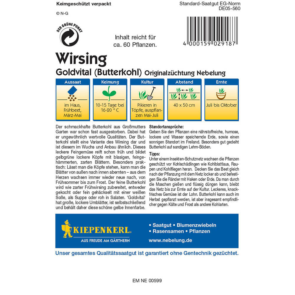 Obsah balenia:1 ks Kel s dlhou dobou zberu. Od júla do decembra ju možno zberať a po častiach spracovávať. Hlávky sú počas letných mesiacov otvorené a je možné tak zvonku zberať jednotlivé listy. Vnútri stále dorastajú nové a krehké listy sviežej zelenej farby. Neskôr sa uzavrú do pevnej hlávky, ktorú je možné v chlade skladovať po dobu niekoľkých týždňov. Kel sa vyznačuje vysokým obsahom vitamínu C, vlákniny a kyseliny listovej. Využíva sa na detoxikáciu organizmu, na posilňovanie imunitného systému a na znižovanie hladiny cholesterolu v krvi. Obsahuje 60 ks semien.