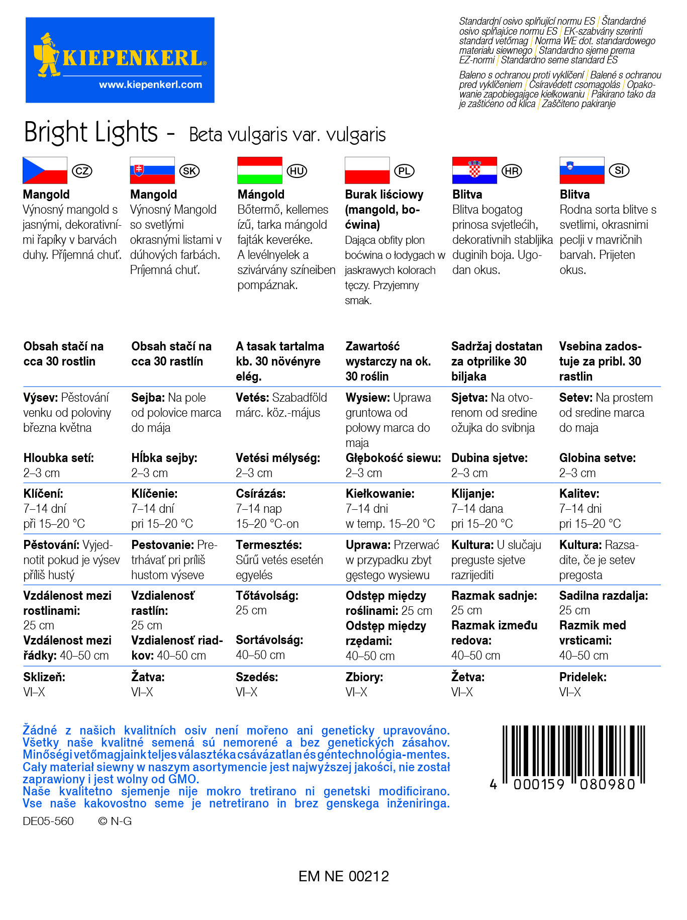 Obsah balenia:1 ks Dekoratívne listové stonky vo všetkých farbách dúhy. Ide o farebnú odrodu mangoldu, ktorého odtiene sú od oranžovej, cez bielu či ružovú. Príjemná chuť. Hodí sa na vonkajšie pestovanie. Na slnečnom mieste alebo v polotieni mu vyhovuje záhradná pôda s humusom. Znáša mierne mrazy. Možno ho pestovať aj v skleníku.