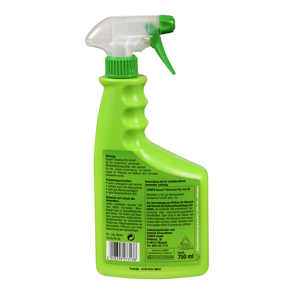 Obsah balenia:1 ks Compo Duaxo Univerzálny fungicíd je systémové protiplesňové činidlo, ktoré bolo špeciálne vyvinuté pre "malé aplikácie" v záhrade, ako aj pre rastliny na balkónoch a terasách. Pred použitím fľaštičku pretrepte a napadnuté rastliny postriekajte rovnomerne zo všetkých strán, kým nie sú viditeľne mokré. Odporúča sa ním postriekať aj listy zospodu a používať večer. Balenie: 750 ml